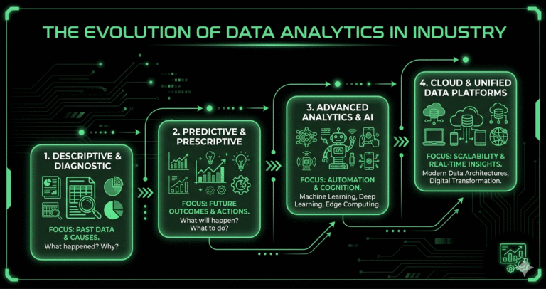 The foundational era laid the groundwork for everything that followed. Without clean, integrated data and reliable descriptive reporting, advanced predictive and prescriptive systems would have been impossible. Many organizations still struggle with these basics today, which explains why data maturity varies widely across industries even in 2026.