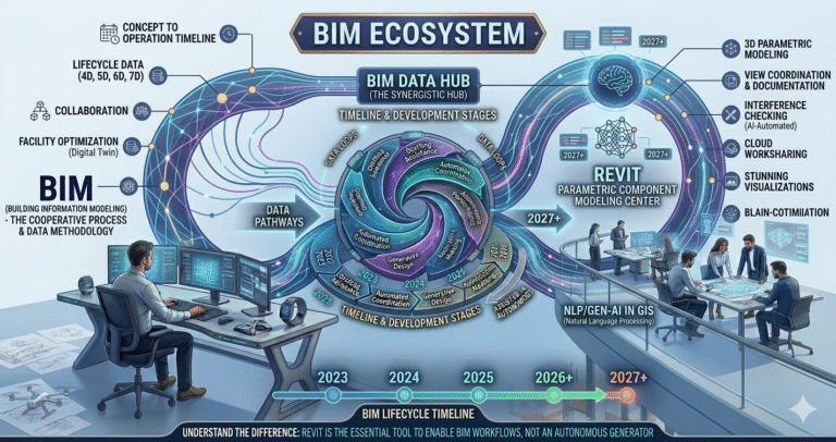 In 2026, BIM maturity in the United States has advanced significantly. Federal mandates (GSA, DoD, VA), state transportation departments, and large private developers require BIM Level 2+ on most public projects. BIM now routinely includes 4D (scheduling), 5D (cost), 6D (sustainability/energy), 7D (facilities management), and increasingly 8D (health & safety) dimensions. AI and machine learning are enhancing BIM through automated clash detection, generative design, predictive maintenance, and digital twin synchronization. BIM is the overarching philosophy and ecosystem—Revit is just one of many tools that can be used to author BIM-compliant models.