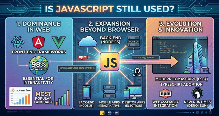 JavaScript is not just still used — it is more dominant and more essential in 2026 than at any point in its history. It runs everywhere: browsers, servers, mobile devices, desktops, edge networks, IoT devices, and increasingly embedded systems. Its ecosystem is the richest, its innovation cycle the fastest, its talent pool the deepest, and its developer experience among the best.